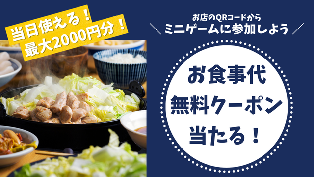 席にあるQRコードを読み込んで チェックイン するだけで、なんと 最大2,000円分のお食事無料クーポン が抽選で当たります。